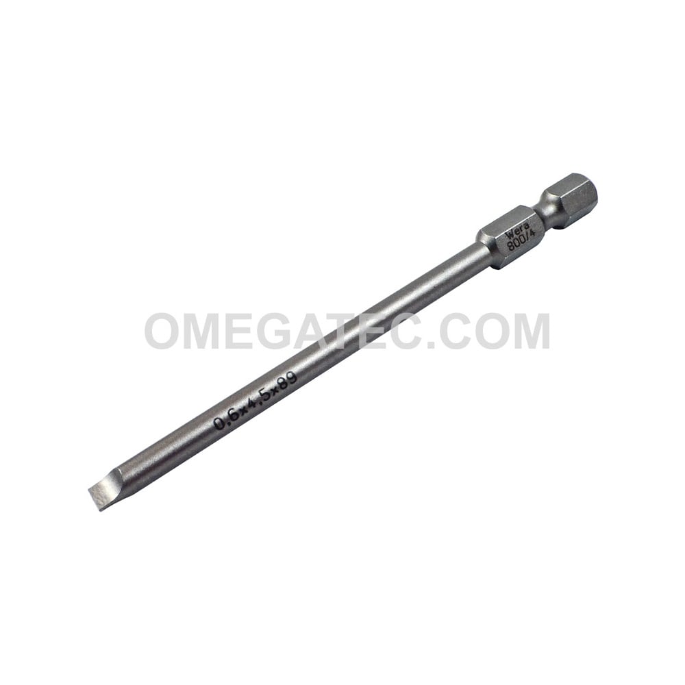 Wera 800/4 Z Punta Plana con Impulsor de Poder de 1/4”. Grueso de la Cuchilla: 0.6mm Ancho de la Cuchilla: 4.5mm Diámetro del Vástago: 4.5mm Longitud Total del Vástago: 89mm / 3 1/2”
