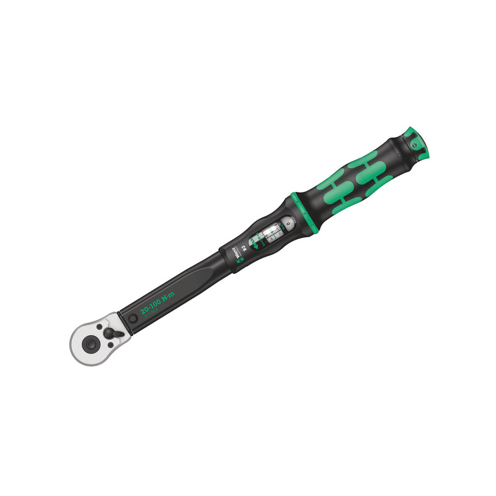 05075611001 Wera Llave de Torque Click-Torque B 2 con Carraca Reversible. Tamaño de Montaje: 3/8” Graduación de la Escala Principal: 0.5Nm Rango de Medición de la Escala Principal: 20-100Nm Rango de Medición de la Escala Secundaria: 15-73lbf.ft. Longitud de la Llave: 405mm/15 15/16” Longitud del Mango: 140mm/5 33/64” Diámetro del Reloj: 47mm Diámetro de la Cabeza: 43mm Altura de la Cabeza del Trinquete: 18.5mm/45/64” Diámetro del Reloj: 1 27/32” Diámetro de la Punta: 1 11/16”