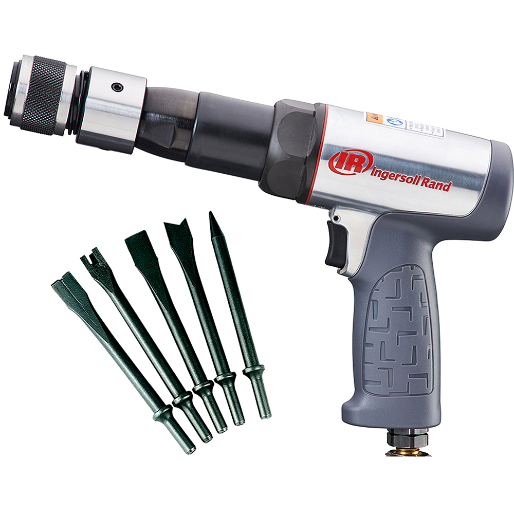 El 119MAXK Ingersoll Rand Juego de Martillo Neumático de Barril Largo con Reducción de Vibración y 5 Cinceles, 2530 BPM, ofrece el impacto que necesitas para realizar el trabajo rápida y cómodamente. Ideal para trabajos de escape y tren delantero, corte general de pernos, colocación de pasadores y trabajos de corte de carrocería.