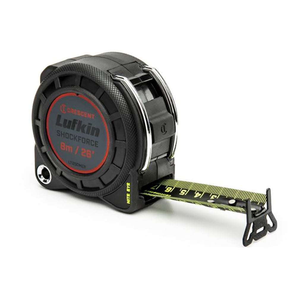 L1125CMEB-02 Lufkin 1-3/16” x 8m/26′ Cinta Métrica Shockforce Nite Eye G1 Dual Sided. Lufkin Shockforce™ Cintas Métricas cuentan con un impresionante alcance de 15 pies y han sido probadas por caídas desde 100 pies sobre concreto sólido, demostrando su robustez. Con una hoja de doble cara con marcas verticales en la parte trasera y ergonomía de primer nivel, estas cintas están preparadas para convertirse en el nuevo estándar para los profesionales del oficio. Además, las versiones Shockforce Nite Eye™ ofrecen todas las características robustas del Shockforce original, pero con la ventaja adicional de la hoja verde de alta visibilidad en negro Nite Eye, asegurando legibilidad en cualquier condición de iluminación.
