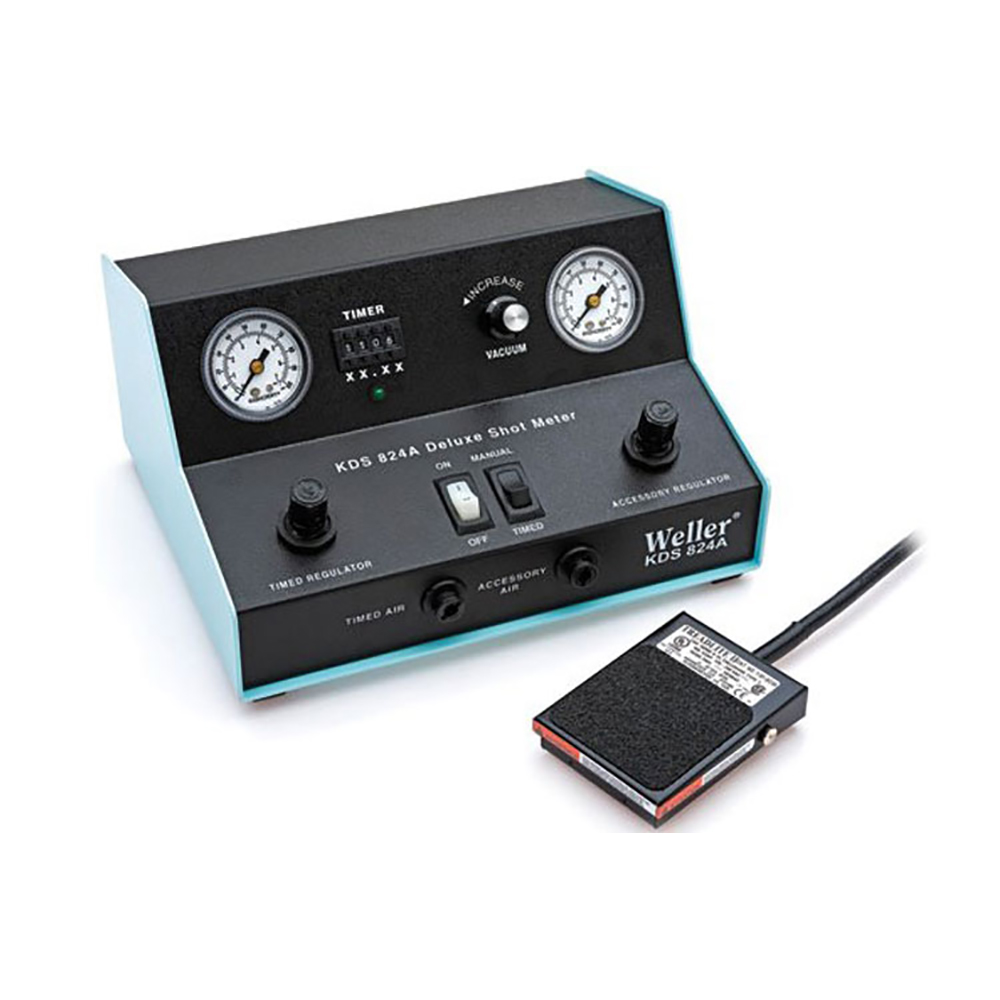 T0053163699N Weller KDS824A Medidor de Disparos Deluxe. Los dispensadores Weller tienen un tiempo de disparo ajustable de 0.01 a 99.99 segundos y una característica de vacío que evita goteos. Los dispensadores cuentan con un pedal de pie accionado eléctricamente y un canal sin control de aire por tiempo.